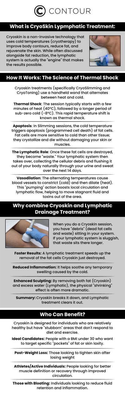 At Contour Medical Spa, we offer CryoSkin Lymphatic Drainage, an advanced treatment using the CryoSkin machine to stimulate lymphatic flow and promote detoxification. This non-invasive procedure combines thermal shock therapy (alternating hot and cold temperatures) and calf electrode stimulation to enhance circulation, reduce swelling, and eliminate toxins. Unlike manual massage, our CryoSkin Lymphatic Drainage helps reduce fluid retention, improve skin tone, and leave you feeling rejuvenated and energized. Experience a personalized, soothing treatment designed to support your body’s natural healing process at Contour Medical Spa. For more information, contact us or book an appointment online. We are conveniently located at 18641 Devonshire Street Northridge, CA 91324.
